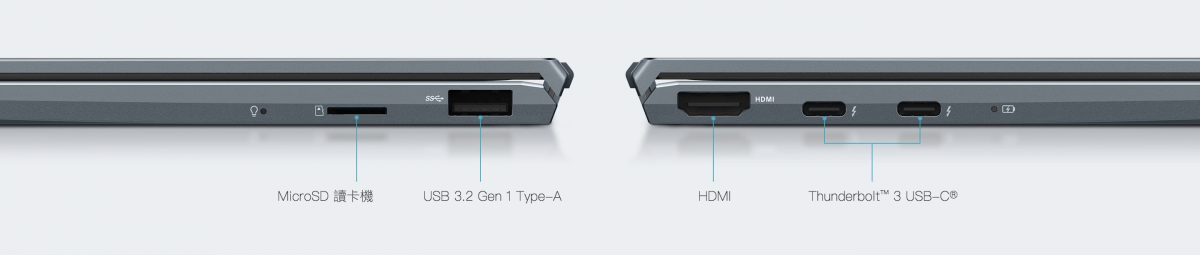 ZenBook 13(UX325)可以提供完整的連線能力--全尺寸的 HDMI 和 USB Type-A 連接埠,兩個強大的 Thunderbolt™ 3 USB-C 連接埠,不僅支援快速充電、4K UHD 外接螢幕,還可達到最高 40Gbps 資料傳輸速度。不僅僅如此,還可以使用 MicroSD 讀卡機輕鬆傳送資料。