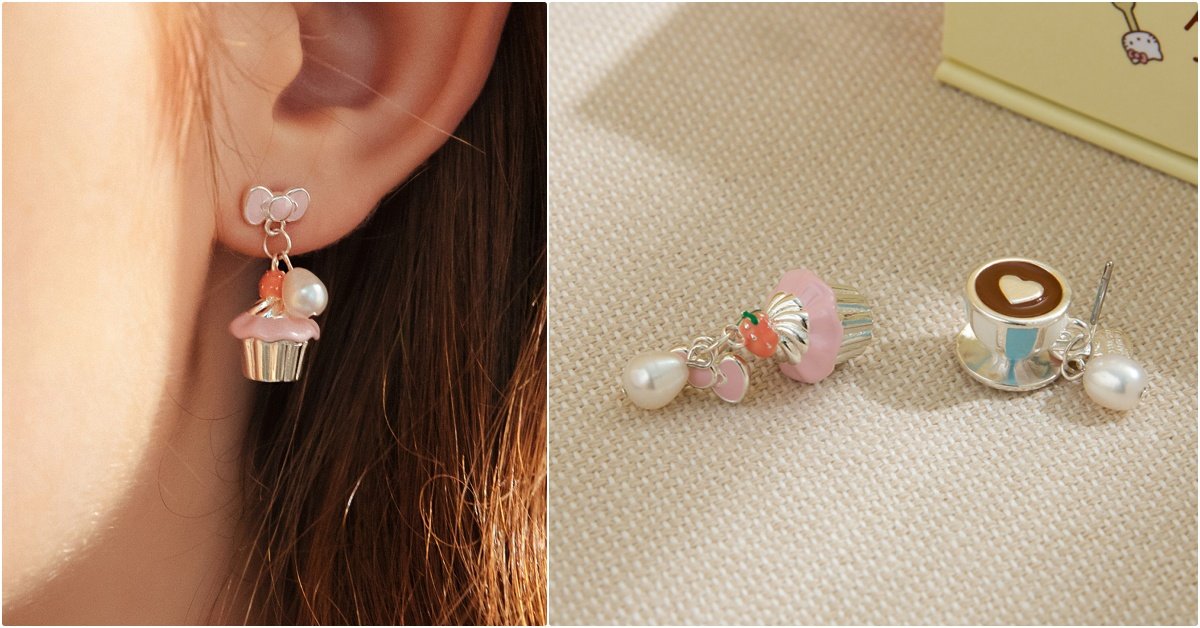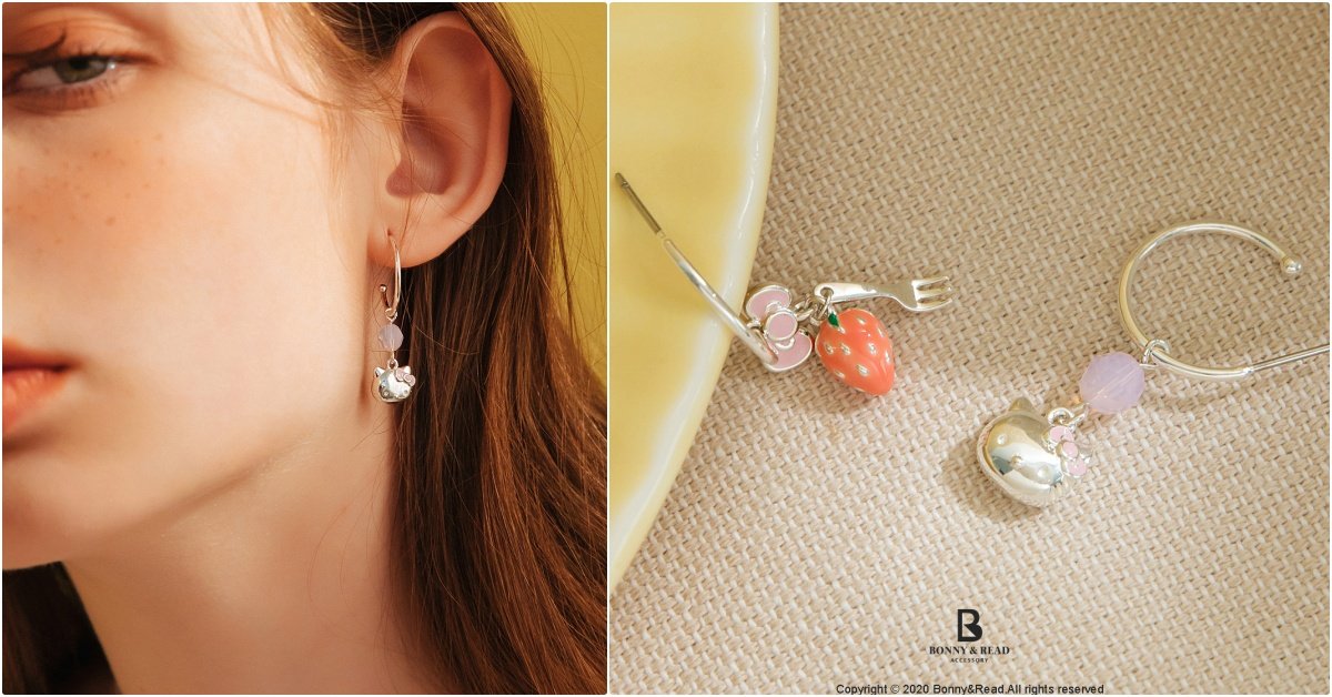 「甜蜜野餐耳環」一耳是粉色的餐匙,一耳是粉藍的餐叉,搭配KITTY特寫大臉、招牌蝴蝶結、珍珠以及碎鑽點綴,獨特又甜美,「甜心可可午茶耳環」和「草莓午茶耳環」把下午茶必備的熱可可、草莓戴上耳尖,「草莓甜心耳環」以粉色施華洛世奇水晶呼應鮮紅的草莓,吸睛度超高的垂墜設計,讓你緊緊抓住天菜的目光。(以上耳飾都有夾式、針式選擇)