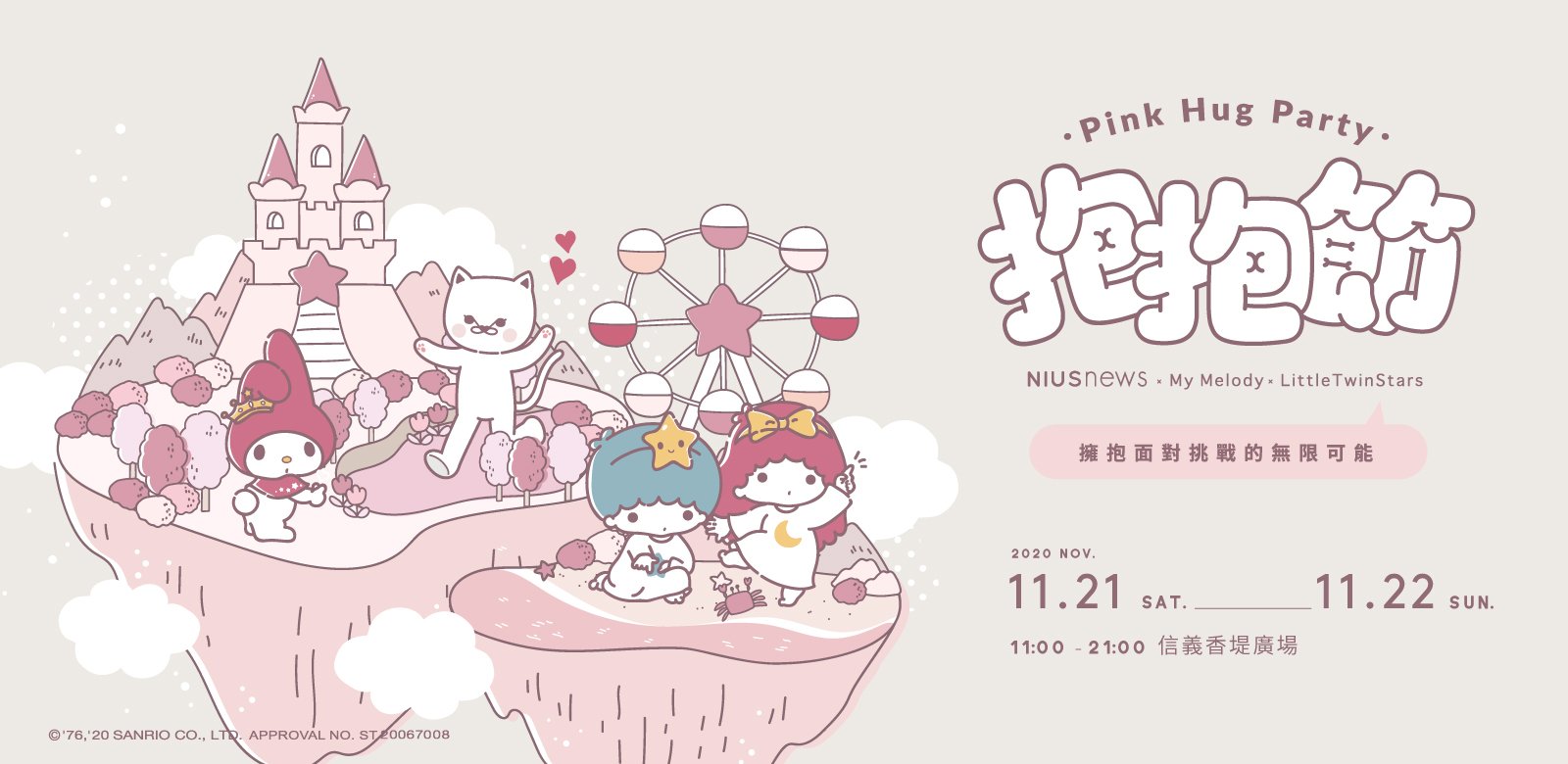 想看更多Hello Kitty?妞新聞x三麗鷗抱抱節在11月21日、22日超萌登場,雙星仙子、美樂蒂等可愛角色都會出沒在2020妞新聞抱抱節,信義香堤大道與你不見不散喔~