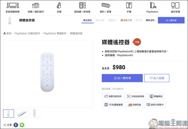 此外,當時這款 PlayStation 5 專用的媒體遙控器截至目前在 Sony 官網釋出的圖片都有四個「空白鍵」(如下圖),遙控器利用內建的播放/暫停、向前快轉與向後快轉按鈕能快速瀏覽影音媒體。