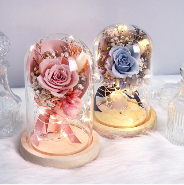 這款造型燈,嚴選日本進口永生玫瑰製作成玻璃鐘罩造型燈,獲得許多女性朋友的芳心。實品非常精美有質感,放在客廳、書房等地方都適合。如果想做為禮物,還可以在玻璃罩上客製文字,相信收到的人會非常驚艷唷!