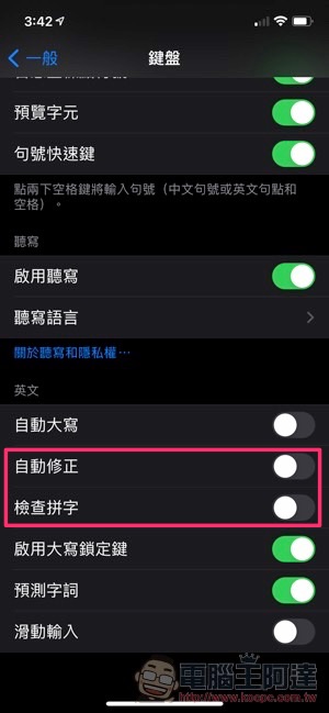 如果重置鍵盤也沒有改變,那麼可以考慮接下來的方法。可以到「一般 > 鍵盤」裡面,找到包括「自動修正」與「檢查拼字」的功能選項,可以嘗試關閉看看,是否有獲得更順暢的鍵盤使用體驗。小編印象自己的經驗是把檢查拼字關掉就突然變順了。