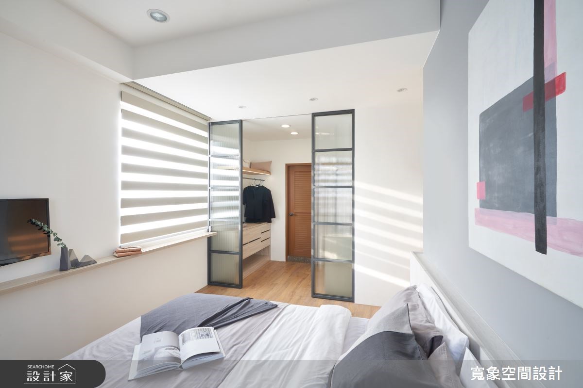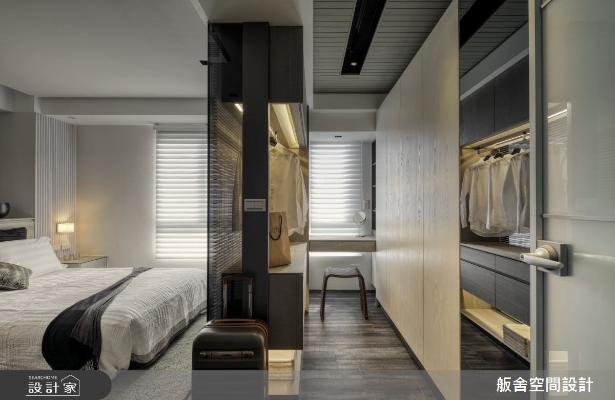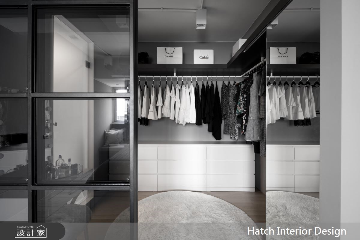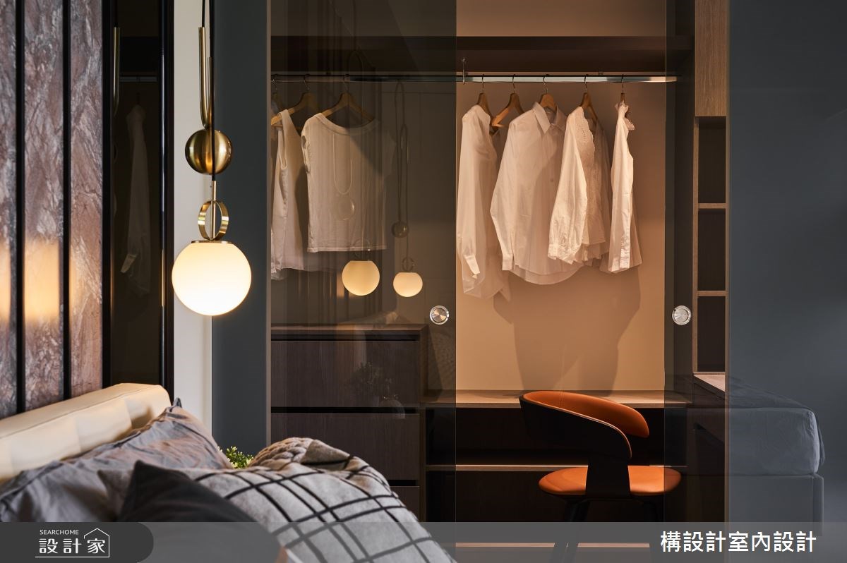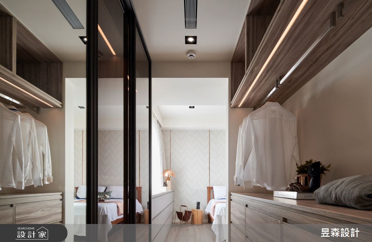 更衣室的入口可以是完全敞開的狀態,讓衣物保持通風,如果還是習慣要有出入空間的儀式感,就能夠在門片的形式上做一些小巧思,像是用隱藏門的手法,讓更衣室入口融進牆面裡,保持空間的簡潔,或者用一道玻璃拉門相隔,可以拉大視覺景深,以上都是不錯的更衣室設計喔!