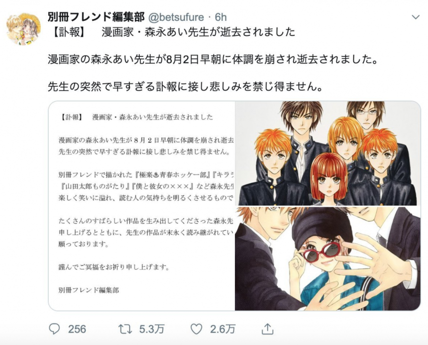 而昨天,代表《貧》的原作者森永愛的出版社就發推特,證實消息指森永愛於8月2日早上因為身體不適離世,死因不明,而令不少粉絲感到震驚。