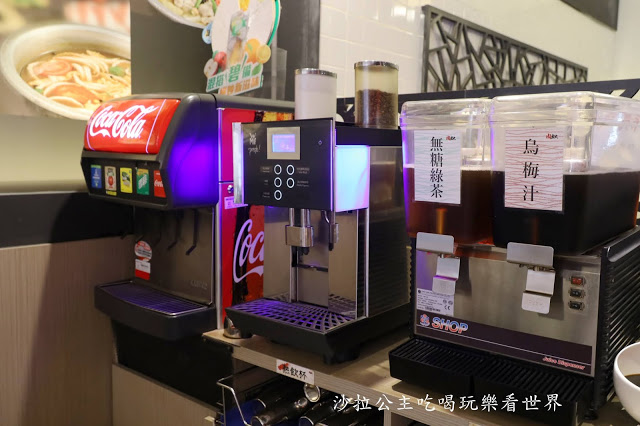 飲料有氣泡飲機、咖啡、烏梅汁、無糖綠茶,特調飲品請以當天提供為主