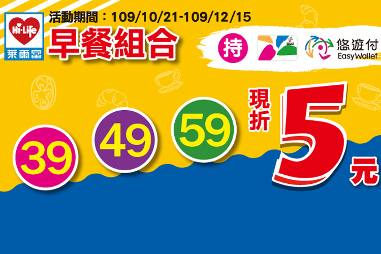 活動期間內,以悠遊卡/悠遊聯名卡/悠遊付購買萊爾富早餐鮮食選組合餐(39、49、59),享5元現折優惠。