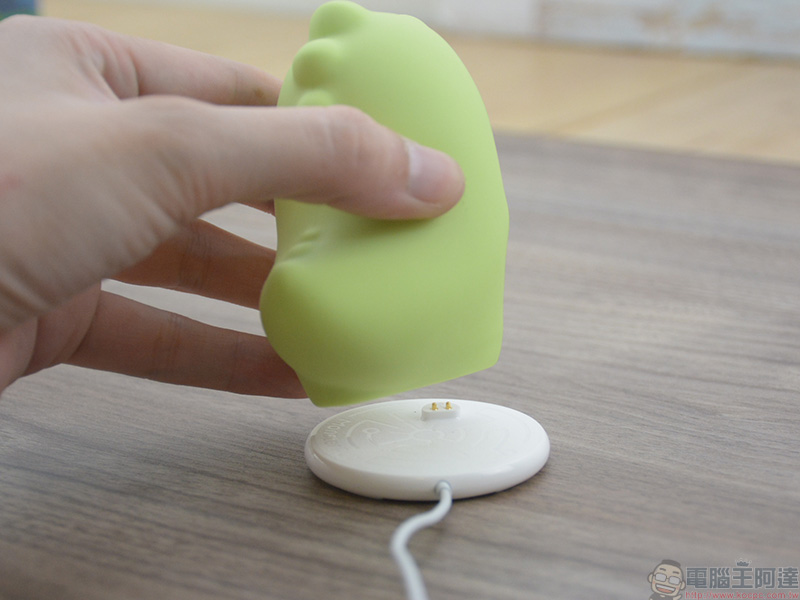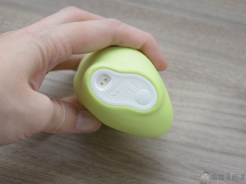 在小怪獸魔吻的底部則是磁吸充電埠與開關的所在,也就是說在這一次新品小怪獸魔吻身上沒有任何一個開口,所以防水能力更優異,清洗時更加便利。電源按鈕除了開關的功能外,還能在與手機沒有連線的狀態下,手動享受小怪獸魔吻的熱情之吻。