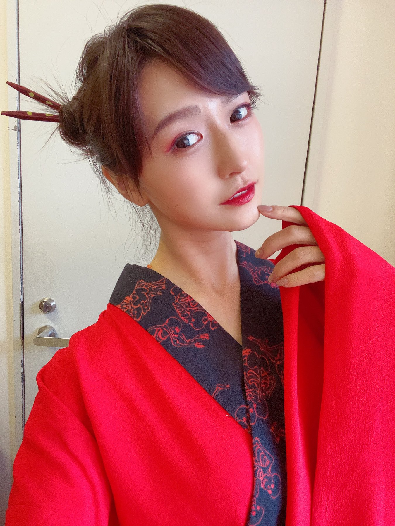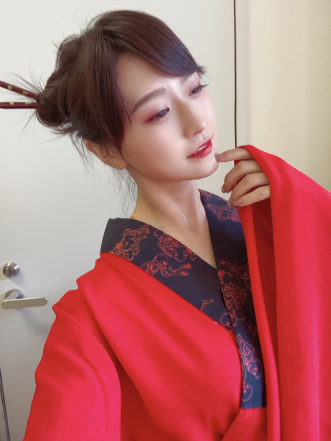 紛紛表示想知道模特兒的IG,原來她是專業模特兒Aimi(あいみ),示範中她穿著豔紅的和服,擺出各種高難度的動作,讓網友驚呼連連。