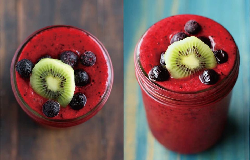 奇異果中含有豐富的膳食纖維和抗氧化物質,能夠幫我們有效促進腸胃,搭配上養顏美容好夥伴莓果類,打出來的冰沙是好喝又甩肉。