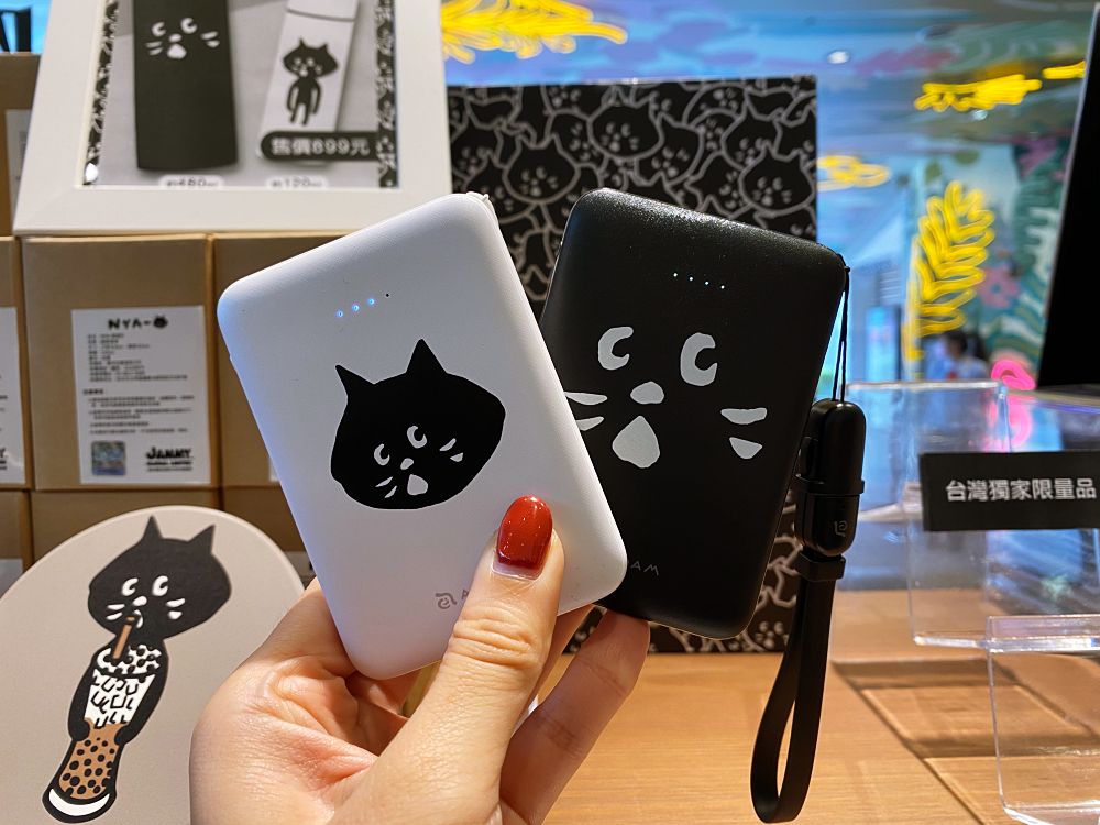 台灣限定的週邊有杯墊與行動電源,杯墊散發著濃濃在地特色,是NYA-喝台啤、飲珍奶的模樣;行動電源則是與亞果元素聯名的商品,共有白、黑兩種款式,電池容量為5000毫安培,輕便好攜帶。