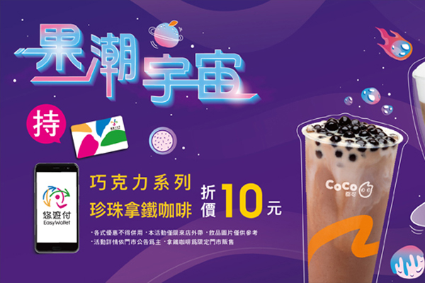 活動期間,持悠遊卡/悠遊付至CoCo都可門市享『巧克力系列』、『珍珠拿鐵咖啡』折價10元優惠。