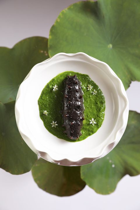 特別將炸蔥、青蔥與大量嫩蔥煨煮的醬汁一同攪打,呈現的翡翠色澤彷彿西湖湖水,巧妙妝點的韭菜花蕊則如湖中之島,領略既是饌亦是景的上等美味。