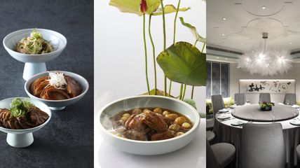 取老母雞、鮑魚、鵝掌汁,以文火煨煮數小時,濾出原汁後再以慢火收乾,口感彈牙入味,鵝掌軟潤腴滑,入口即化!