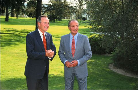 國王胡安卡洛斯一世和布希總統(President George H.W. Bush)在馬德里王宮前侃談。