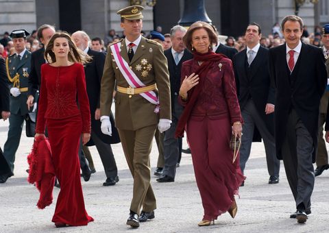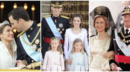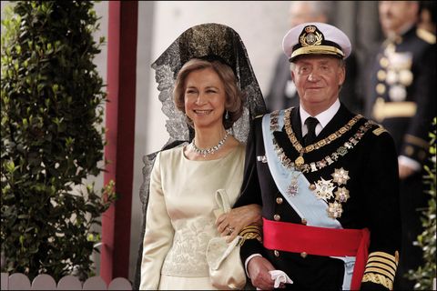 蘇菲亞王后與當時的國王胡安卡洛斯一世,在菲利浦王子的婚禮上嶄露出滿足笑容。