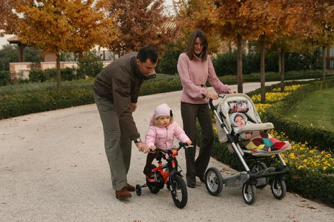 菲利浦和萊蒂西亞帶著女兒在公園中享受幸福的家庭時光。