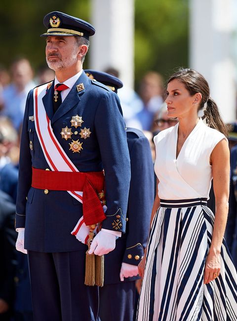萊蒂西亞王后穿上優雅條紋裙裝,與西班牙國王菲利浦六世共同出訪位於聖哈維爾的軍事學院General Military Academy。