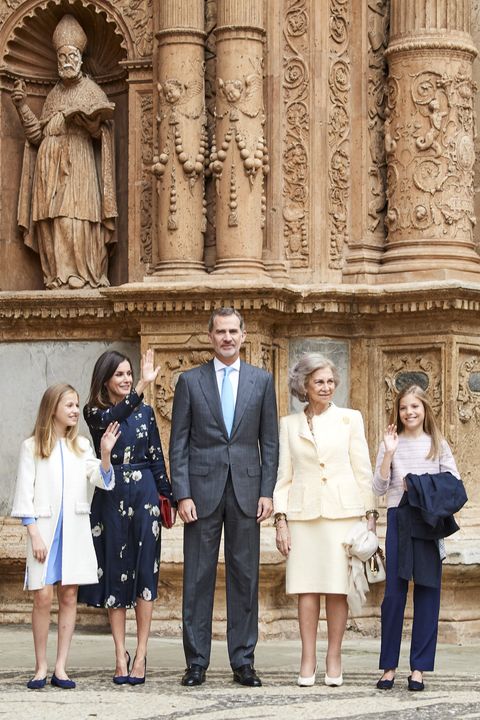 蘇菲亞王后、國王菲利浦六世、萊蒂西亞王后、蘇菲亞公主和萊昂諾爾公主在感恩節的上午,於帕爾馬主教座堂(Cathedral of Palma de Mallorca)前和民眾招手。