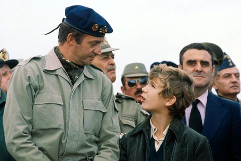 年輕的菲利浦在美西軍隊演習時,看向父親胡安卡洛斯一世。