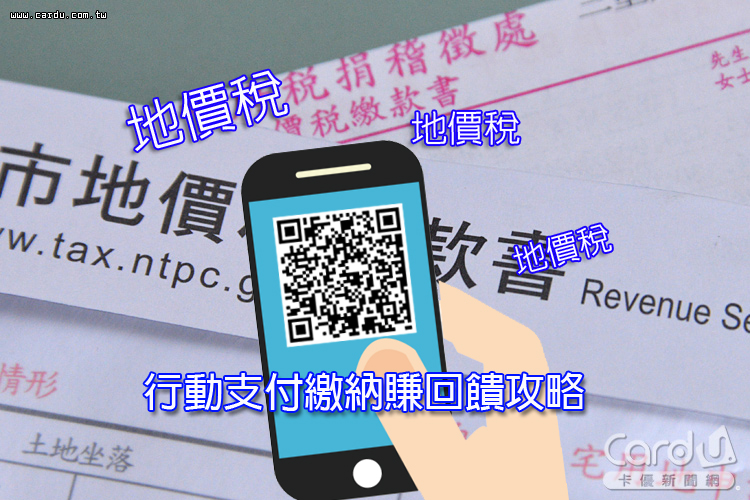 | 台灣 Pay | 全區 | 台灣 Pay APP (含各銀行台灣 Pay或台灣行動支付 APP),可以透過掃描稅單上的 QR Code進行地價稅的繳交,也支援使用信用卡或銀行帳戶進行繳稅。台灣 Pay綁指定銀行(合作金庫、第一銀行、華南銀行、彰化銀行、兆豐銀行)每筆送50元刷卡金,限量筆數10,000筆,每戶回饋上限200元。 |