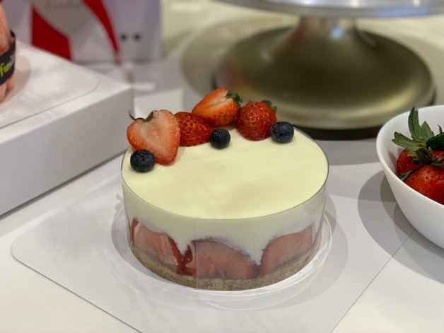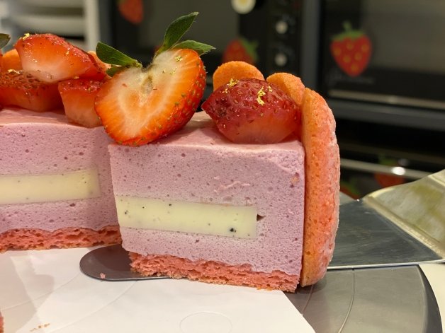去年的人氣款「杜樂麗凡登」,以法國的凡登廣場為概念,蛋糕體為覆盆莓棉花糖蛋糕,中間夾著酸甜的「紅醋栗果實」和「香草籽奶酪」,頂層鋪上滿滿的草莓,最外層佐以達克瓦茲,撒上金箔,給人一種奢華感,吃起來口感甜而不膩,而且外觀讓人彷彿一秒身處在法國班!