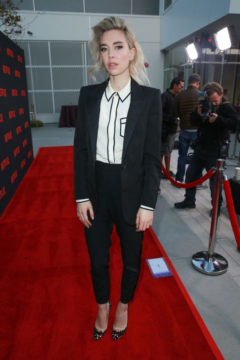 穿西裝式洋裝的凡妮莎寇比顯得氣質大方, V 領低胸設計是性感關鍵,露出一雙長腿大秀婀娜美態,搭配高跟鞋充分展現酷酷女人味。