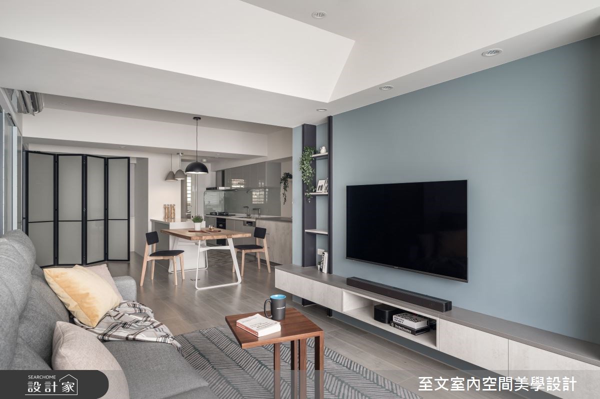 將飽和度拉高,混合著灰的藍綠色彩在木質調的空間中很容易成為焦點卻不會過於搶眼。不論是視覺上偏向湖水綠或者土耳其藍的色調,重色系再搭配上不需要透過裝飾,單純平面塗料就能轉化大地棕色的空間氛圍,帶出歐美精品質感。由於這類色彩相較於淺灰藍更有份量,因此使用在空間上可以用家具單品進行搭配,像是灰藍色的絨布沙發、或是量體較大的收納櫃以灰藍噴漆裝飾,都可以顯得空間更為立體有個性。