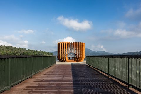 以竹藝為創作材料的范承宗,發現構築手法與鳥類有異曲同工之妙,他透過精密的木板與繩索交錯結合,型塑出和諧、柔軟的放射鏤空裝置藝術,打造出當代意象的巢穴,讓人在遠處就被吸引,甚至情不自禁地停下腳步駐足小歇於此,也同時飽覽日月潭風光。