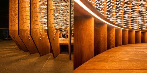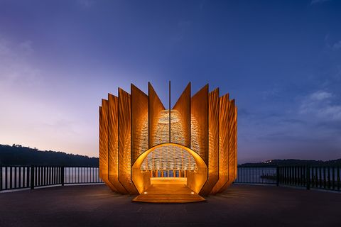 到了夜晚,供人們停留片刻的「青背山雀」巢,由內而外地打出柔和黃光,微光在優雅的湖面中閃爍,在黑夜中微微綻放,與壯闊的山脈相互呼應。
