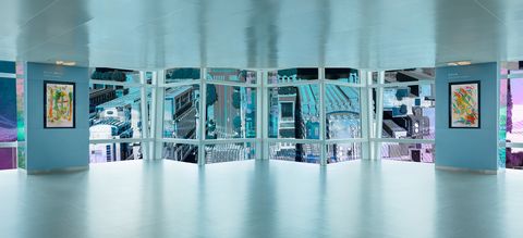解讀當然不只有一種,林育良鼓勵大家在參觀時盡量發揮自己的視角。例如在另一幅作品中,他把觀景台原本播放電視廣告的兩根柱子,替換成兩幅孩童的畫作,畫作內容則是三到十歲孩子心中的台北101印象,可能是大樓、煙火,或簡單三個數字101。觀景台看出去的景色,則替換成全俯瞰的地景。所謂事物的「表」和「裡」,再次出現有趣的玩轉。