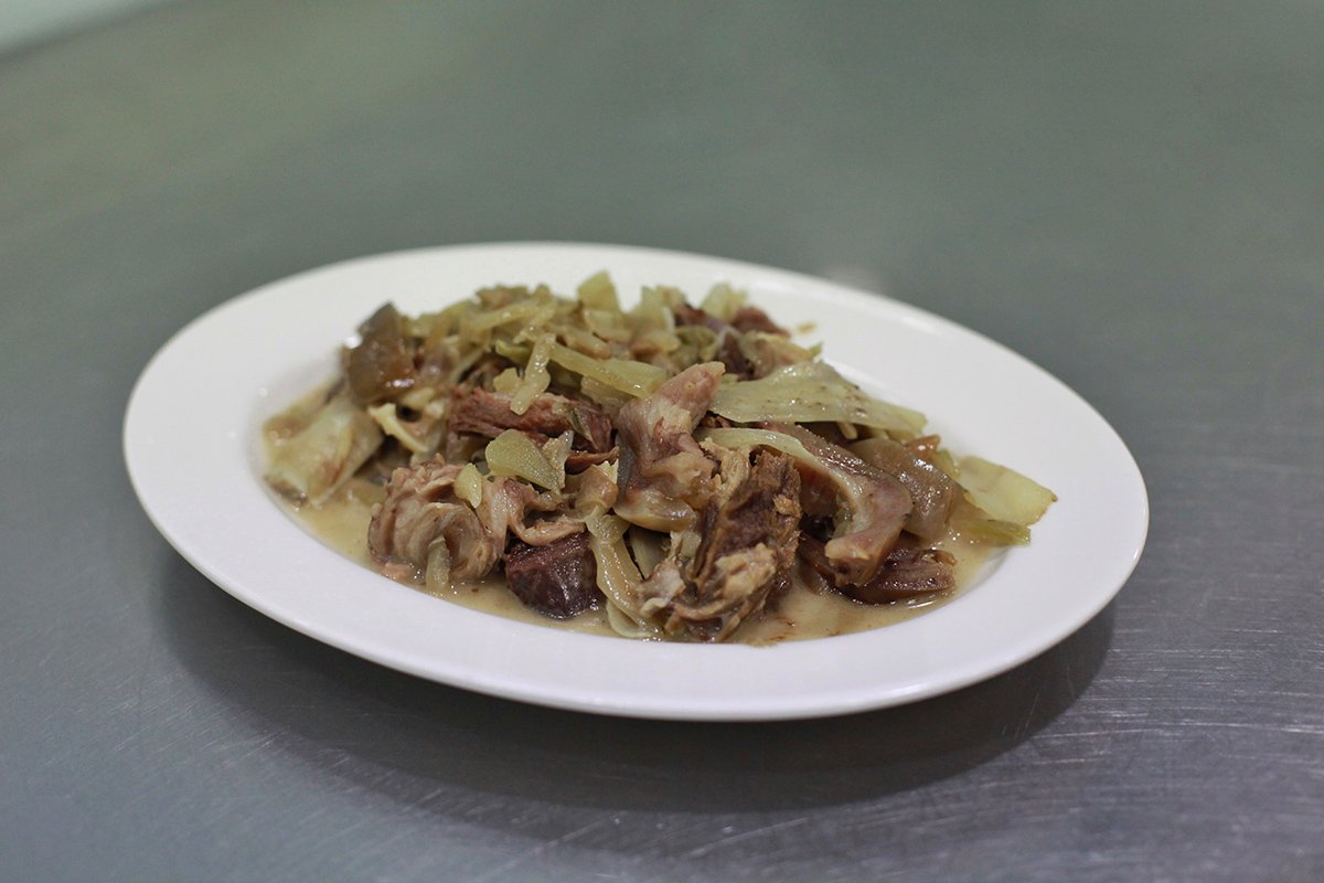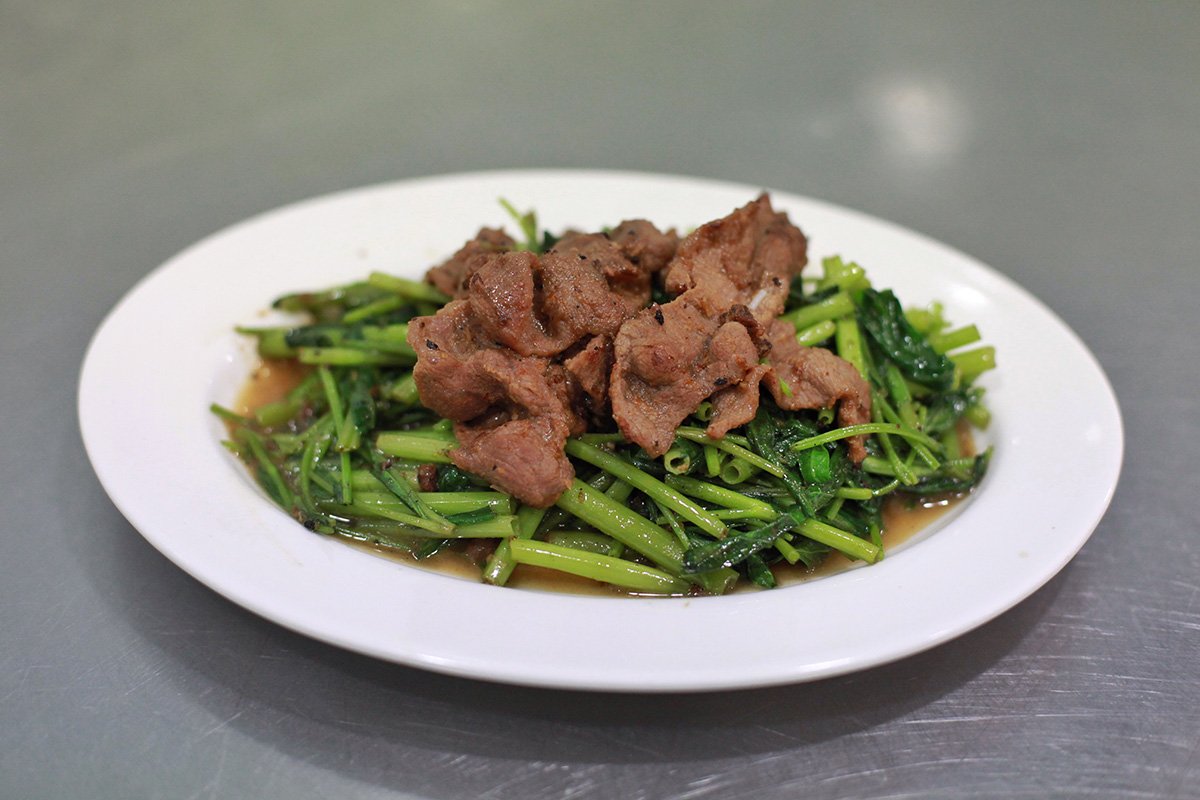 「羊肉炒青菜」看似一道普通的家常料理,沒想到裡頭卻大有玄機,份量十足的羊肉片與時令蔬菜一同熱炒,其中沙茶醬料是店家自製特調,一般沙茶料理吃起來多是重鹹,但這道菜的沙茶不僅嚐起來清爽無負擔且不會喧賓奪主地蓋過羊肉與青菜原本的味道,老闆還分享有些客人獨自用餐無法吃完這麼多道配菜,就會點羊肉炒青菜再加份麵線,既能吃飽也能同時嚐到店家招牌。
