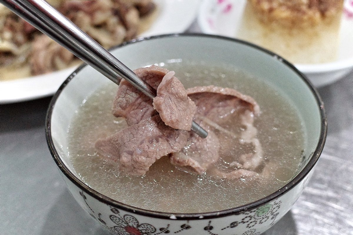 既然來吃全羊料理怎能少了品嚐湯頭呢?這碗「羊肉湯」也是每桌必點料理,使用大骨熬煮不添加任何雞精粉,羊骨會事先川燙過血因此完全不怕有羊腥味,喝起來雖然口感清爽但卻有濃郁的羊乳香氣,就連小朋友也愛不釋手。