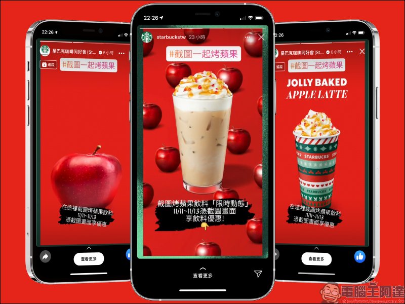 這次星巴克推出的「一起烤蘋果社群好友分享」活動,民眾只要鎖定星巴克咖啡同好會的 Facebook 粉絲專頁或 Instagram ,將限時動態的影片進行截圖,在 11 月 11 日至 11 月 13 日活動期間到店以智慧型手機(或其他數位裝置)出示烤蘋果新品飲料「限時動態」截圖,即可享購買兩杯相同容量/風味/冰熱的飲料其中一杯由星巴克招待,也就是飲料買一送一啦!