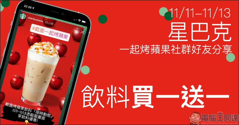 星巴克一起烤蘋果社群好友分享,飲料買一送一活動(11/11-11/13)