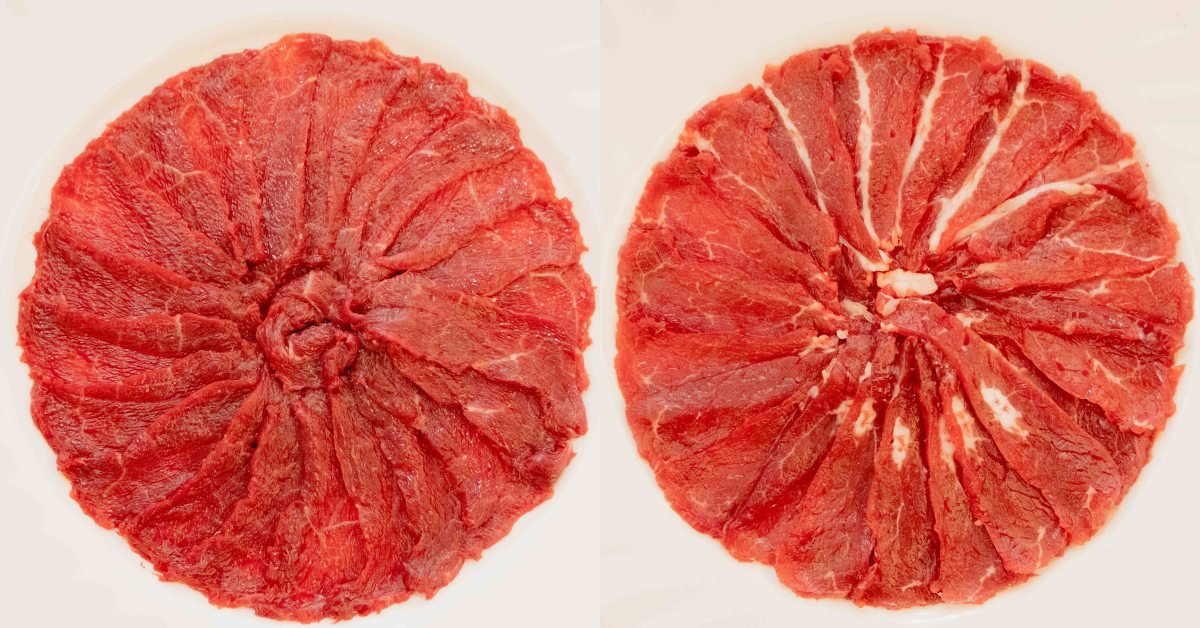 牛肉片的部分有多種部位可以挑選,左圖為「小扇」,是牛的腹脅部位,油花相對較少,口感極佳;右圖為綜合拼盤,是有牛的前胸部位板腱肉&後腿肉,油脂不多、肉質細膩。如果有喜歡的口感(軟嫩/嚼勁)都可以跟店員說,店員會幫你做肉片的搭配喔!