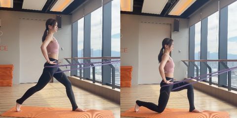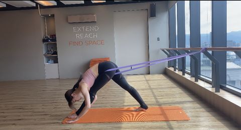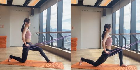 面向把桿,阻力帶套在後側髖關節囊大腿根部,接著雙手抓阻力帶 往後退至阻力帶產生最大張力,單腳往後大步退到「高弓箭步」位置。