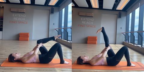 Step 1 .首先躺在瑜珈墊上,雙腳彎曲踩地。接著提起單腿,往胸口方向拉近,可伸展到後臀大肌。