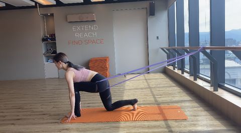 Step3.後方膝蓋輕放地板上(可墊毛巾) 前腳掌踩在膝蓋前側吸氣時骨盆往前移動,前側膝蓋記得往外打開,吐氣時骨盆往後,對抗阻力帶。