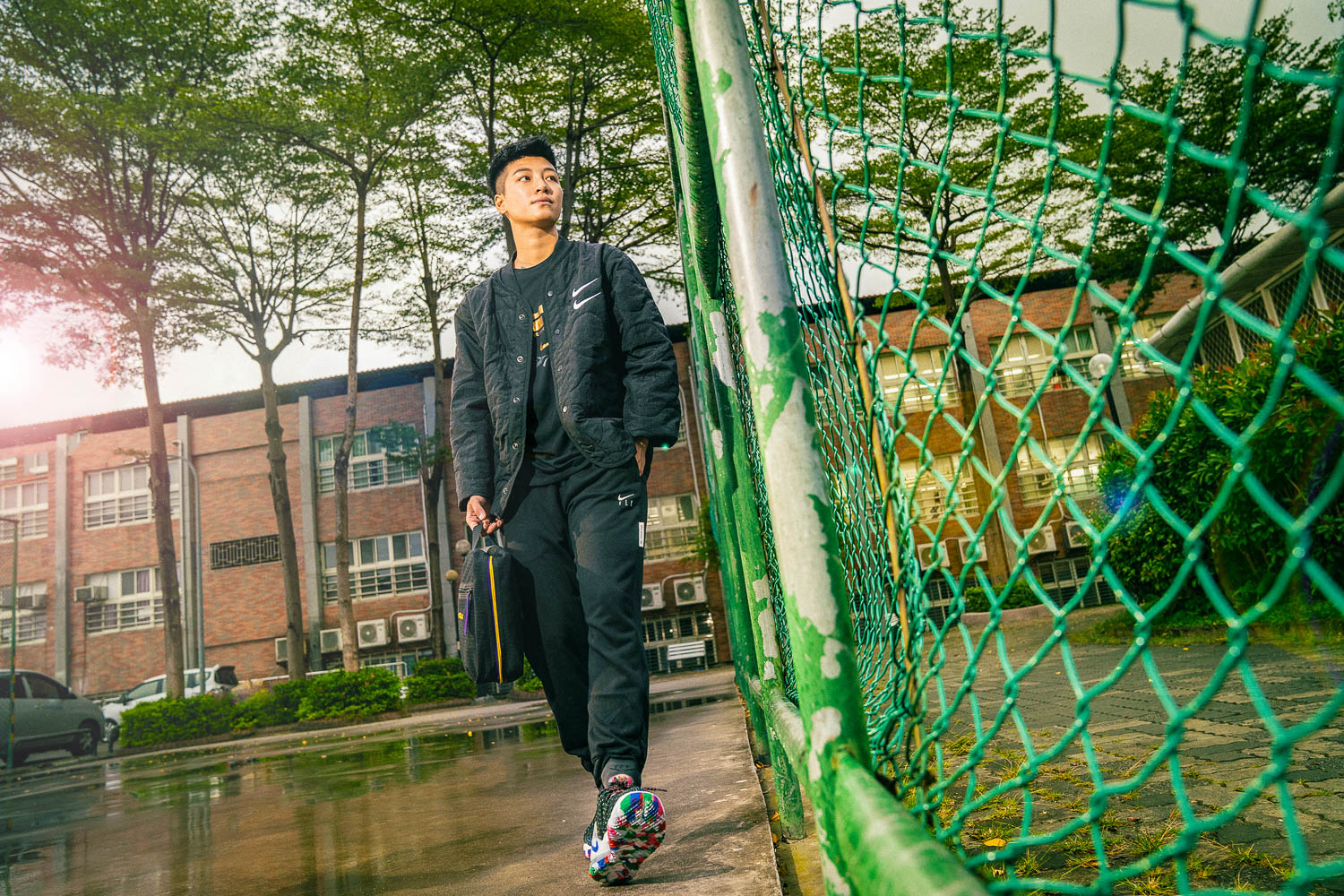 至於平常打扮較中性一些的 Yei 表示,如果出門穿球鞋的話自己會偏好跟球場裝扮做出區隔,這天她全身上下選擇以黑色系為主,讓 LEBRON 18 ‘Multi’ 佈滿彩色塗鴉的模樣顯得更跳、成為視覺焦點,運動棉褲是 Swoosh Fly 系列單品、夾克內所穿的 T-Shirt 寫著 LeBron James 座右銘 ‘Strive For Greatness’、並帶有金色點綴及象徵榮譽的月桂冠,就像是慶祝 LeBron James 剛拿下職業生涯第四座 NBA 總冠軍。個性外向的 Yei 面對鏡頭毫不生澀,前一秒還在跟旁邊友人談天說笑,下一秒進入攝影師取景範圍內隨即展現十足的氣勢,「轉向這邊 OK 嗎?我覺得自己這側的臉比較好看」Yei 臨場還不忘邊跟攝影師溝通,留下最帥的畫面。