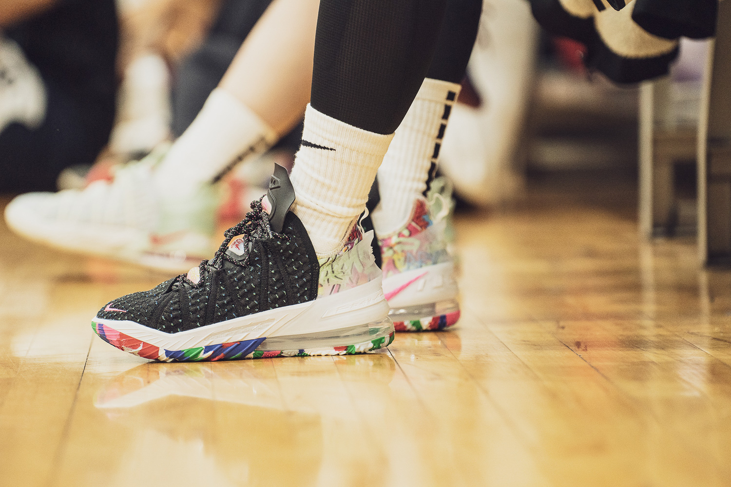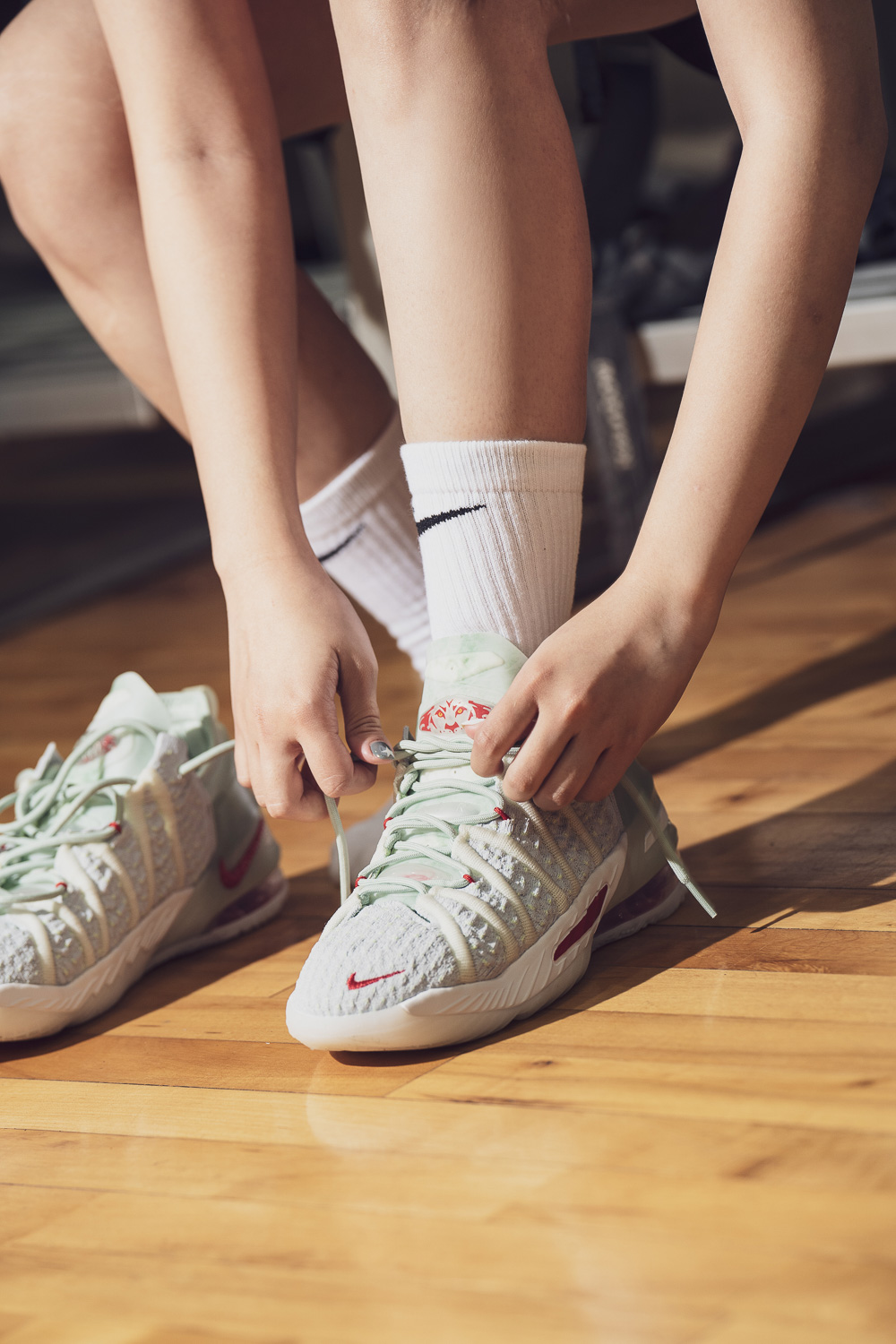 至於腳上的 LEBRON 18,林茉曦說 LeBron 跟 Kobe 就是她這個世代的籃球之神,所以穿上最新簽名鞋很開心 (球聚前還先跟朋友炫耀今天要穿新鞋XD)。對於這雙新裝備,林茉曦首先注意到筒身高度,她曾有過穿高筒鞋打球結果腳踝瘀青的經驗,所以近期的球鞋選擇如 LEBRON 18、Air Zoom BB NXT 都是中低筒身,較低的鞋領跑動起來比較靈活,而且穿搭也好上手。「球打得不好但裝備一定要有,我選籃球鞋也會注重外表的部分!」林茉曦笑著說,接著她又補充道 LEBRON 18 鞋身很貼腳、跑動變向時氣墊踩起來的感覺很對胃口,新朋友初體驗算是相處愉快。說起球鞋,本季 Nike 推出許多 “致敬女性” 的系列產品,LEBRON 18 的專屬圖騰也吸引林茉曦注意,「 以致敬女性而設計出的畫像很象徵 Women Power,遠看又像動物圖騰,平常搭牛仔褲也可以,不侷限在場上,這種配色我就會直接列入考慮。」無愧是裝備組來著,看球鞋還同步考量到穿搭的部份。