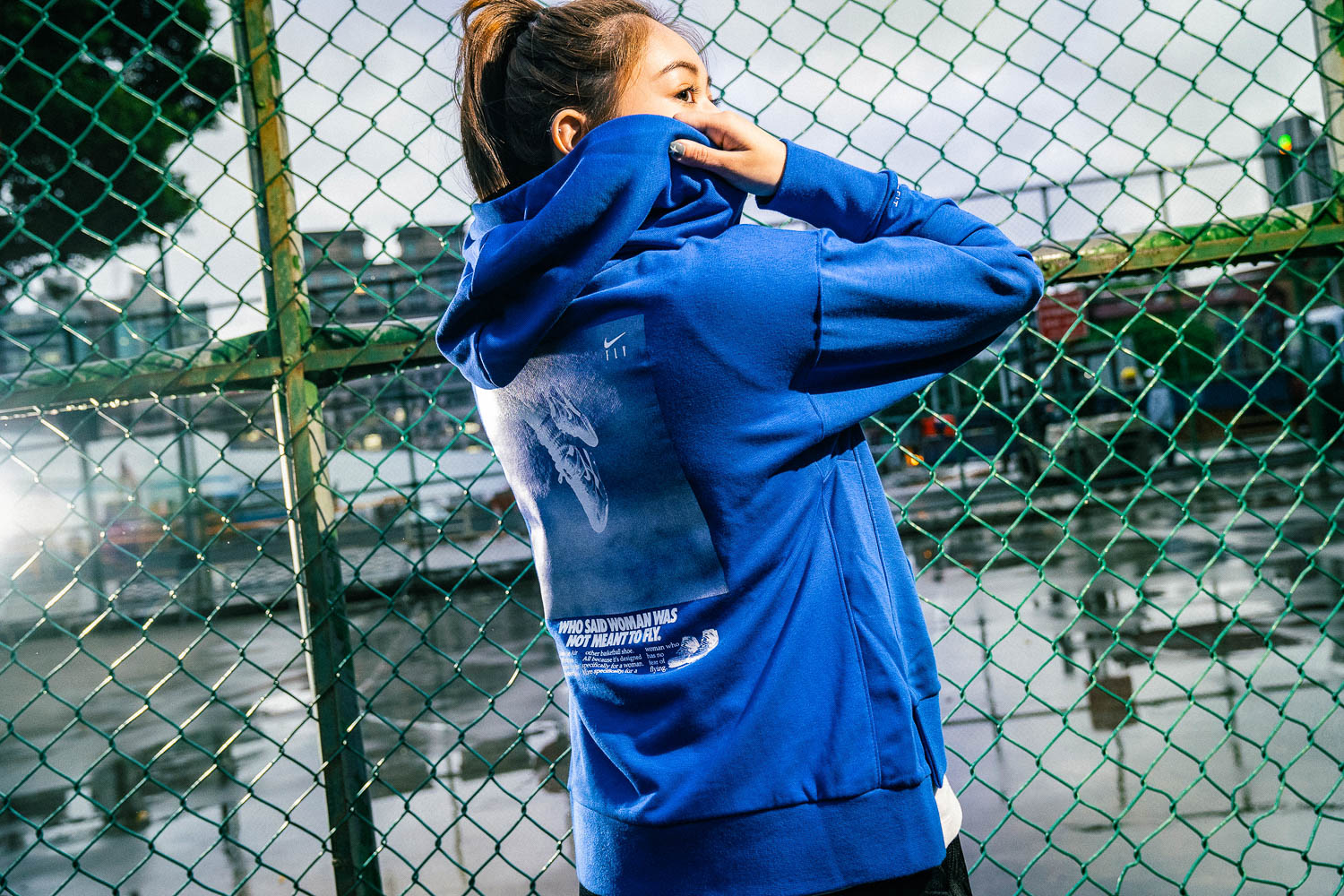 約訪當天是 WoWo Court 每周例行的球聚,打球時間是晚上,而下午我們跟林茉曦、Yei 碰面時從兩人的打扮就能知道,她們對運動前後的穿搭抱持著不同想法。林茉曦的造型對編輯來說有種熟悉感,因為我自己很常就這麼穿著去球場報到 (笑),籃球短褲、一件需要時能罩著頭的連帽長袖上衣還有內搭的白 T-Shirt,連同腳上 LEBRON 18 ‘Empire Jade’ 形成一種逛街 OK 然後也隨時可以報隊開打的狀態。對了,如果打算穿以帝王玉璽為靈感 ‘Empire Jade’ 配色去打球,可要記得先把黃色掛穗給取下來才安全!剛上市不久的球鞋吸睛之外,林茉曦這件連帽上衣更是來自 Nike Basketball 專為女性打造的 Swoosh Fly 系列,採用貼近女性身型的剪裁及設計,為愛運動的女生帶來場內場外切換自如的裝備,而不再是買最小號的男裝。說到女生專屬,暑假時摩曼頓花花 NIKE Jordan 籃球體驗店提供的 Swoosh Fly 球衣客製服務,推出後也是備受歡迎,讓女孩們很有共鳴,期待未來有更加精采的女生限定企劃。