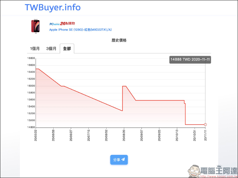 筆者先以 iPhone SE 128GB 為例,截圖當下這款商品在 PChome24h 購物寫到市價15,500 元、特價 14,888 元、限時下殺 612 元,至於這是不是它在 PChome24h 購物最便宜的一次呢?