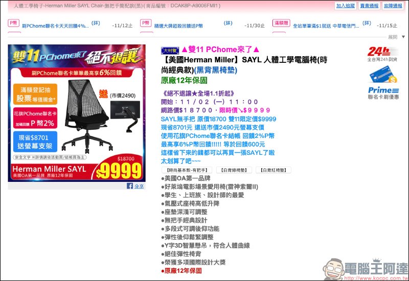 畢竟智慧型手機隨著推出的時間,價格越來越便宜也是相當正常的。因此筆者接著以另一款商品為例,這次是 Herman Miller SAYL 人體工學椅(時尚經典款),題外話這款無扶手且不能前傾調整的時尚經典款算是 Herman Miller SAYL 系列的入門款產品。筆者截圖當下該商品以 9999 元的限時價進行促銷,平台記載的網路價為 18,700 元。