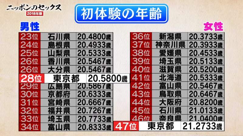 以男女調查結果分開來看發現,性的初體驗年紀東京男性平均20.58歲第28名,但女性平均21.27歲名列最後一名。