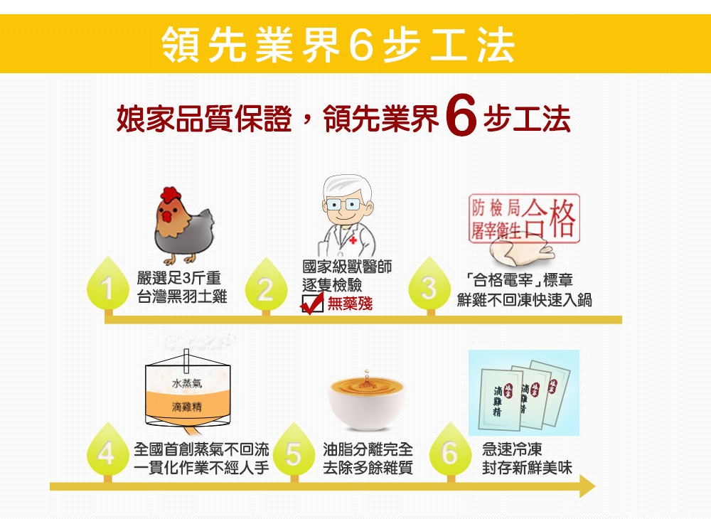 而挑選滴雞精時,最重要的不外乎雞隻的品質與製成的衛生了!娘家品質保證,領先業界6步工法,娘家滴雞精不僅使用台灣純正的黑羽土雞,還有國家級的檢驗確保每隻都健康安全,再加上SGS認證的超嚴謹製程,從頭到到尾不經人手,讓每位媽媽們都能喝到健康又安全的滴雞精~