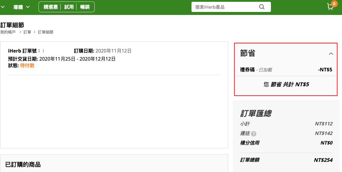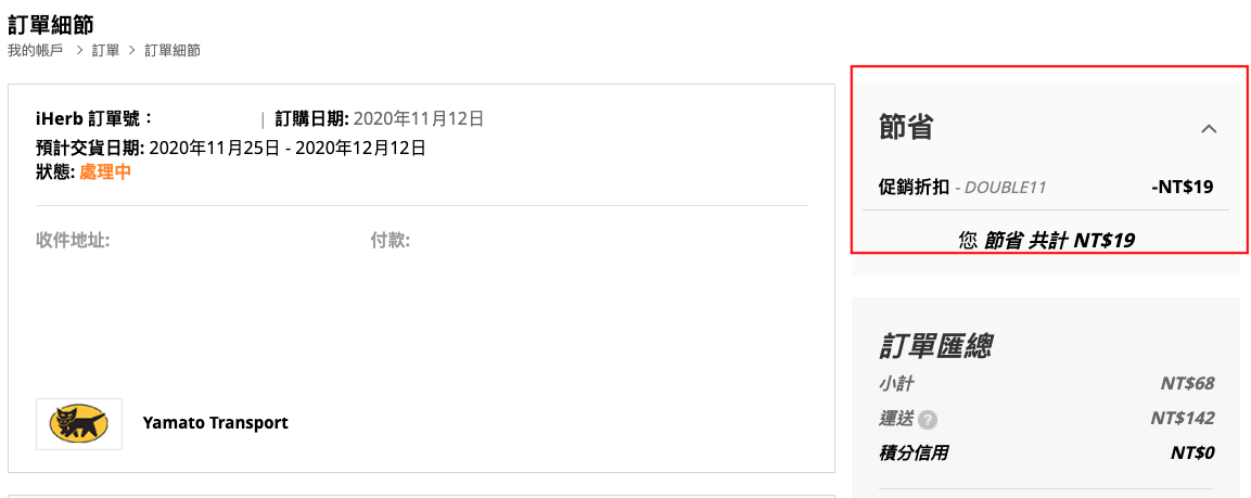 如果使用的是「官方折扣碼」,可在訂單截圖上清楚看到使用哪個折扣碼,以及省下多少金額,