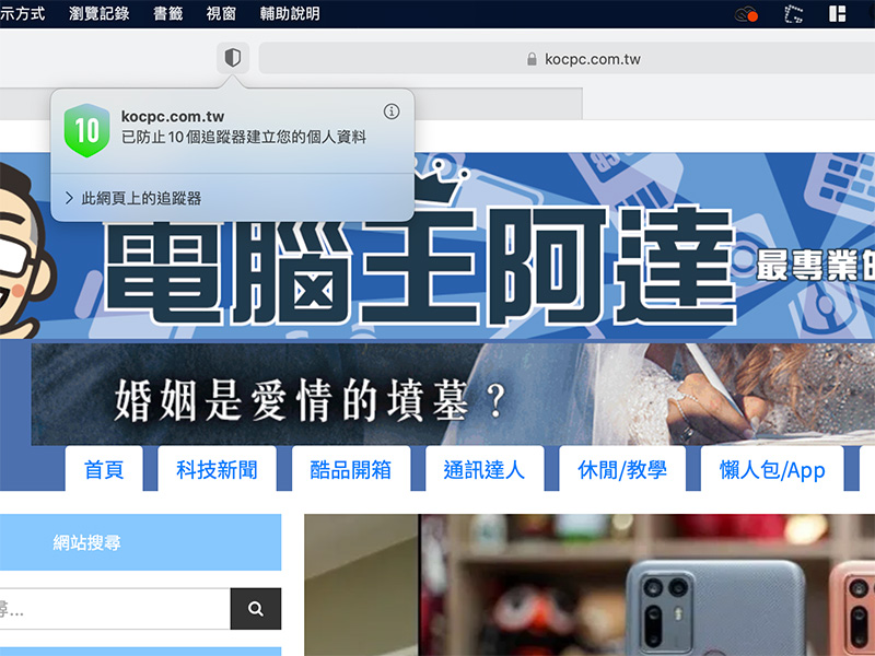 另外,Safari 現在也有內建的隱私報告了。你可以按下任何網站的網址列旁隱私報告按鈕,即可查看 Safari 阻擋了多少企圖以數位指紋方式來追蹤你的追蹤器,你甚至還可以查看它們試圖想要將你的資料發送給哪些網站。