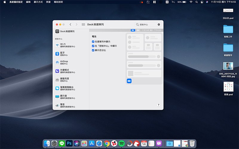 Mac 的控制中心裡面初始選項較 iOS 少了許多,但你可以從「系統偏好設定 >> Dock 與選單列」裡面去選擇將哪些想要快速取用的設定項目新增到控制中心裡面,或是移除哪些功能。