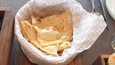 Roomali Roti以白麵粉、奶油做成麵糰,再靠師傅的功力將麵皮拋飛擴展,越飛越大張,最後倒扣在圓頂鍋烤熟,折成四方的手帕形狀,口感吃起來較紮實,麵香炭香濃厚。