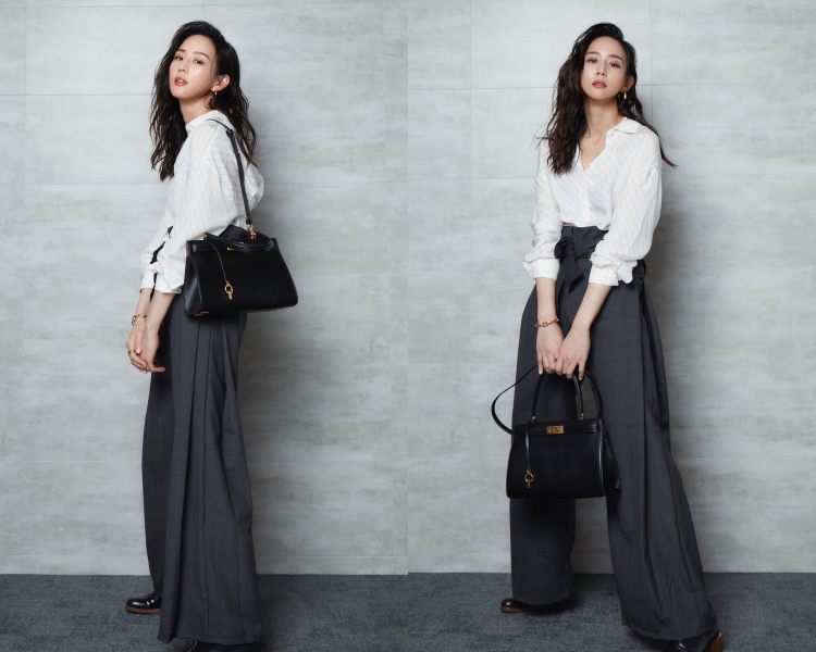 這款 Lee Radziwill 的包款,運用一條宛如腰帶的設計搭配金扣,簡約的外型搭配在張鈞甯身上更顯得摩登感十足,她運用簡單的白色襯衫與寬褲做穿搭,並挑選此戲列的大包款做穿搭,中型包款的大小,加上方正的包型輪廓,不過於複雜的設計,非常適合 OL 做為日常通勤工作時的包款。